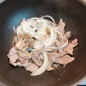 ②フライパンにオリーブオイルを熱し、にんにくチューブを入れる。香りが立ってきたら、豚肉と玉ねぎしめじを炒め、コショウをふっておく。