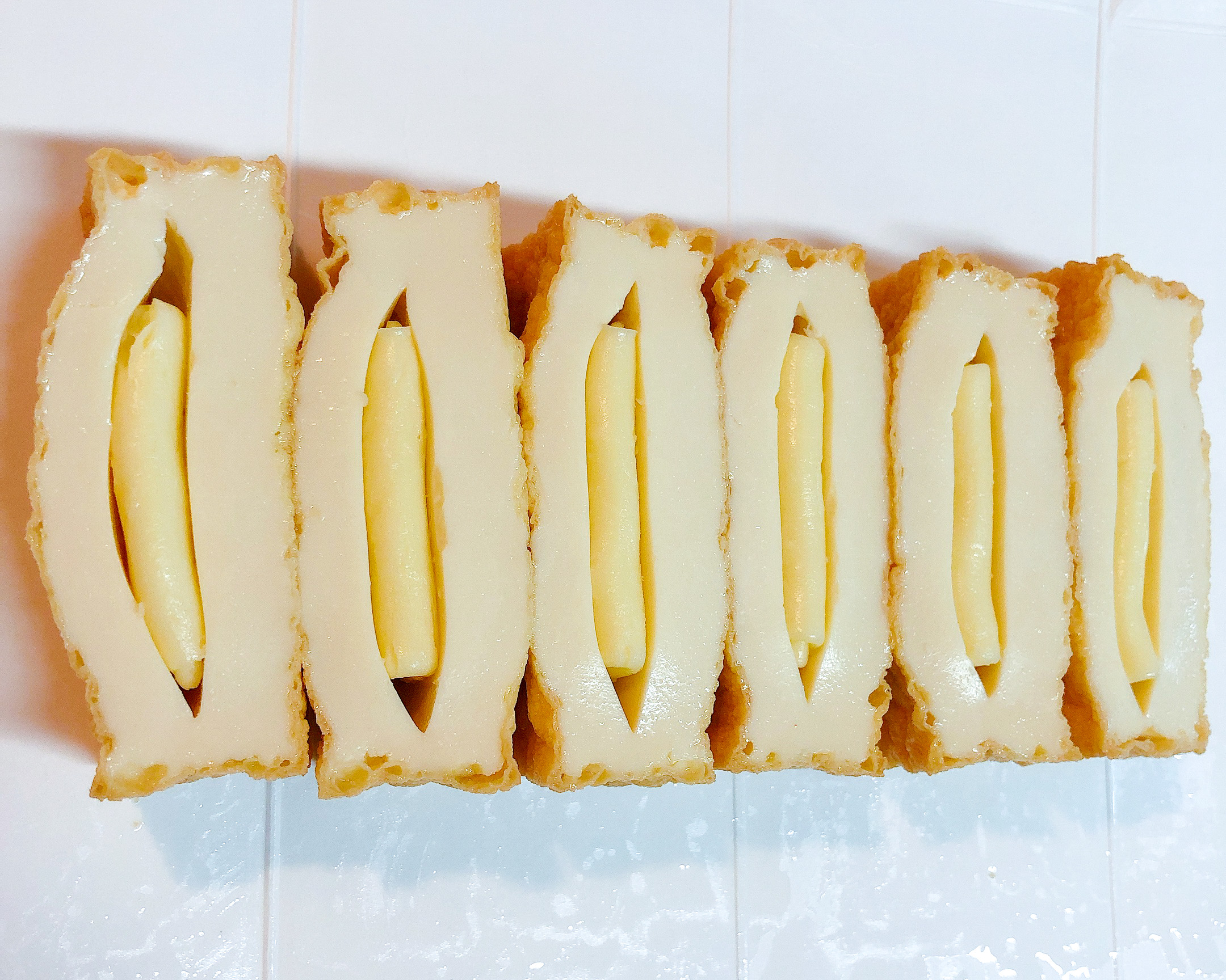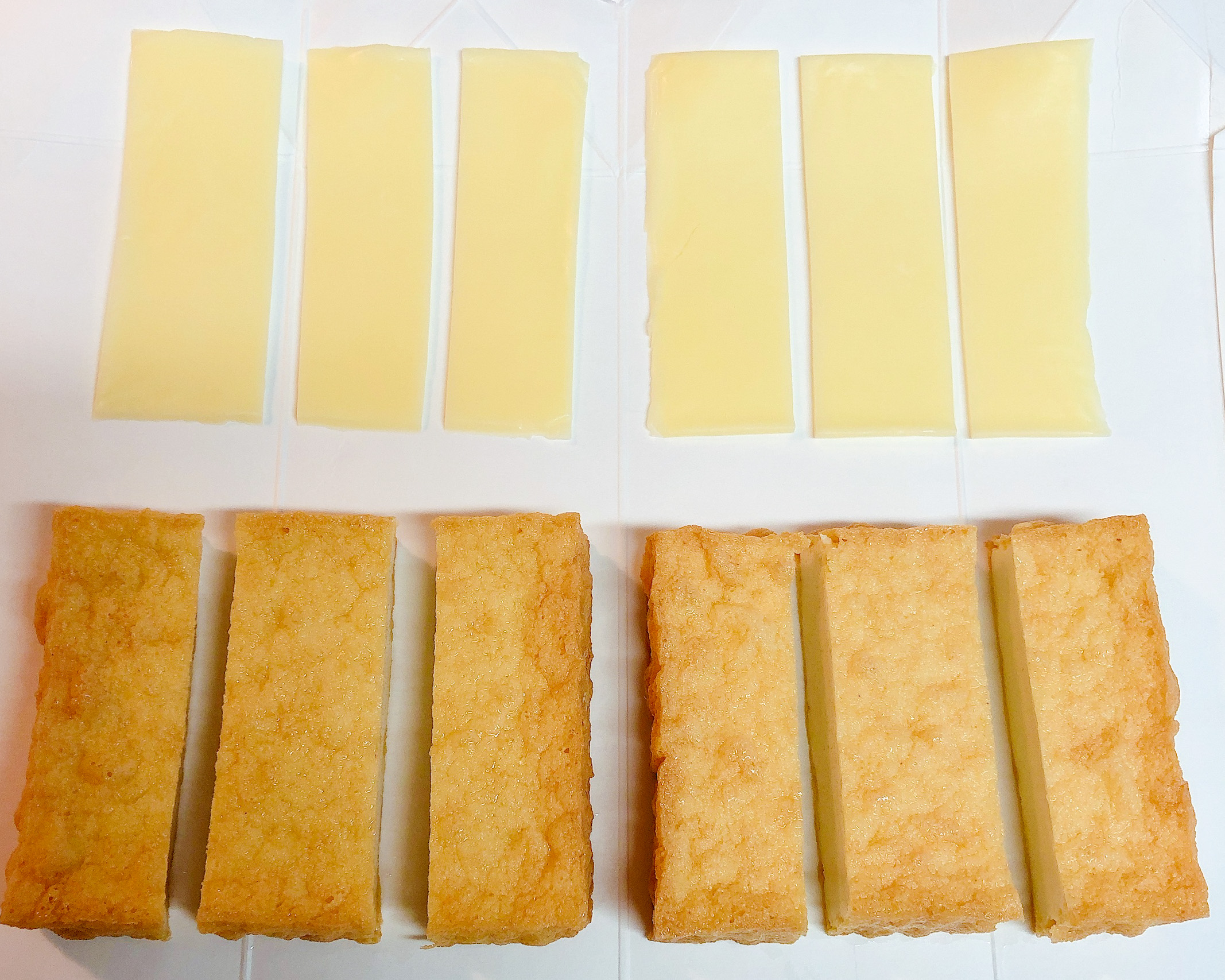 ②切り分けたチーズを1/4サイズに折り畳み、絹揚げの切り込みにしっかり挟む。