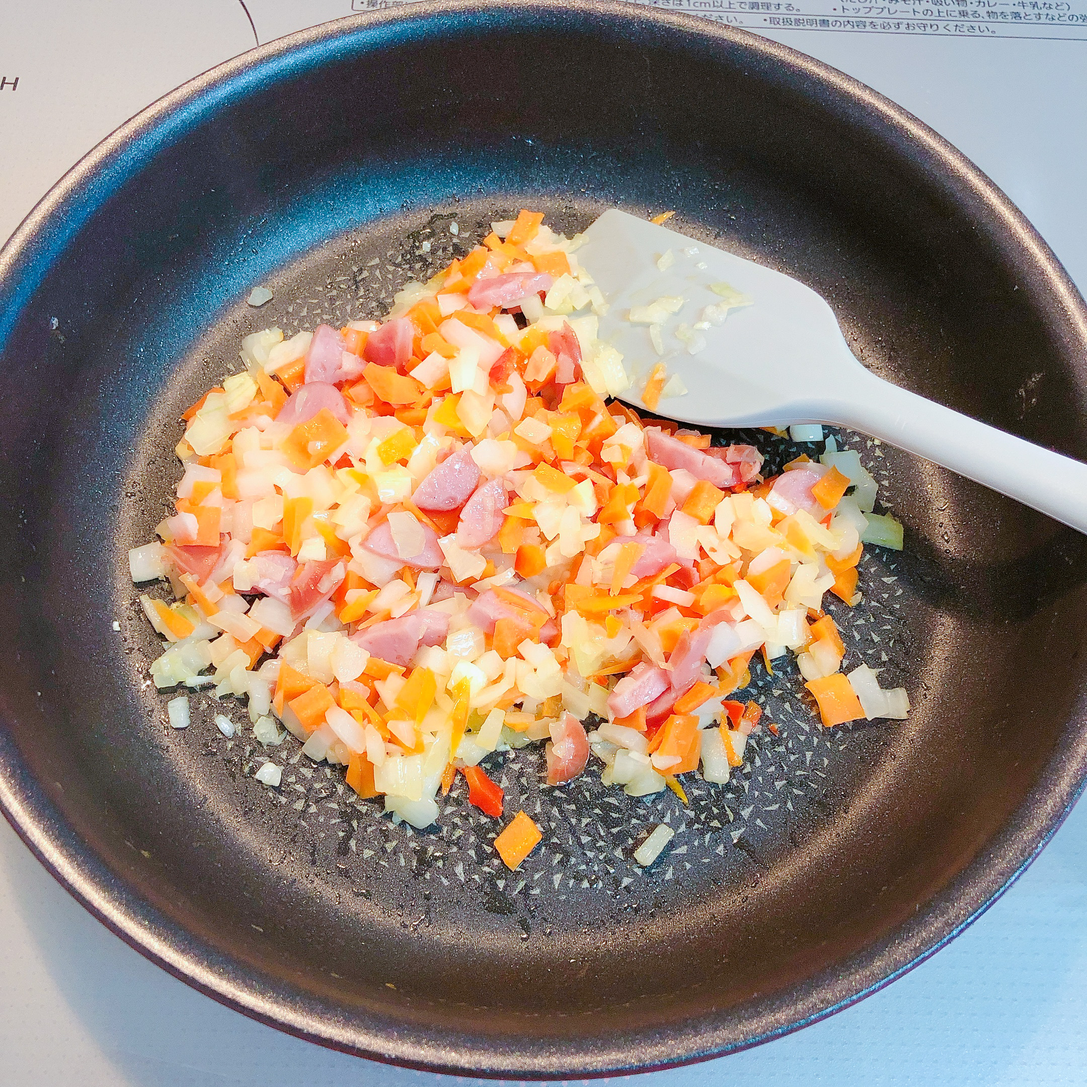 ①玉ねぎ、人参、ピーマンはみじん切りに、ウインナーは輪切りにする。