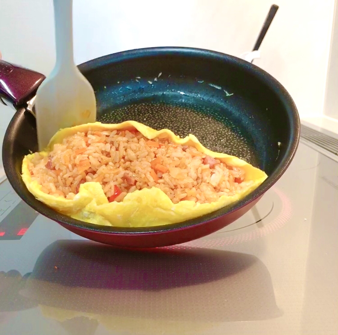 ⑦ケチャップライスを乗せて、フライパンを傾け滑らせ、フライパンのカーブとヘラやターナー等利用しつつ形を作る。