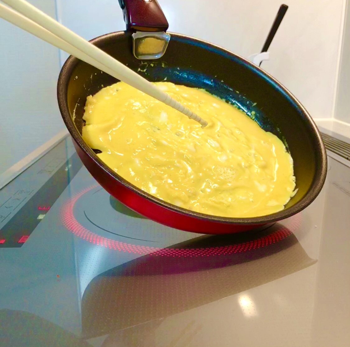 ⑥軽く混ぜて焼いて行き、卵が滑ることを確認する。