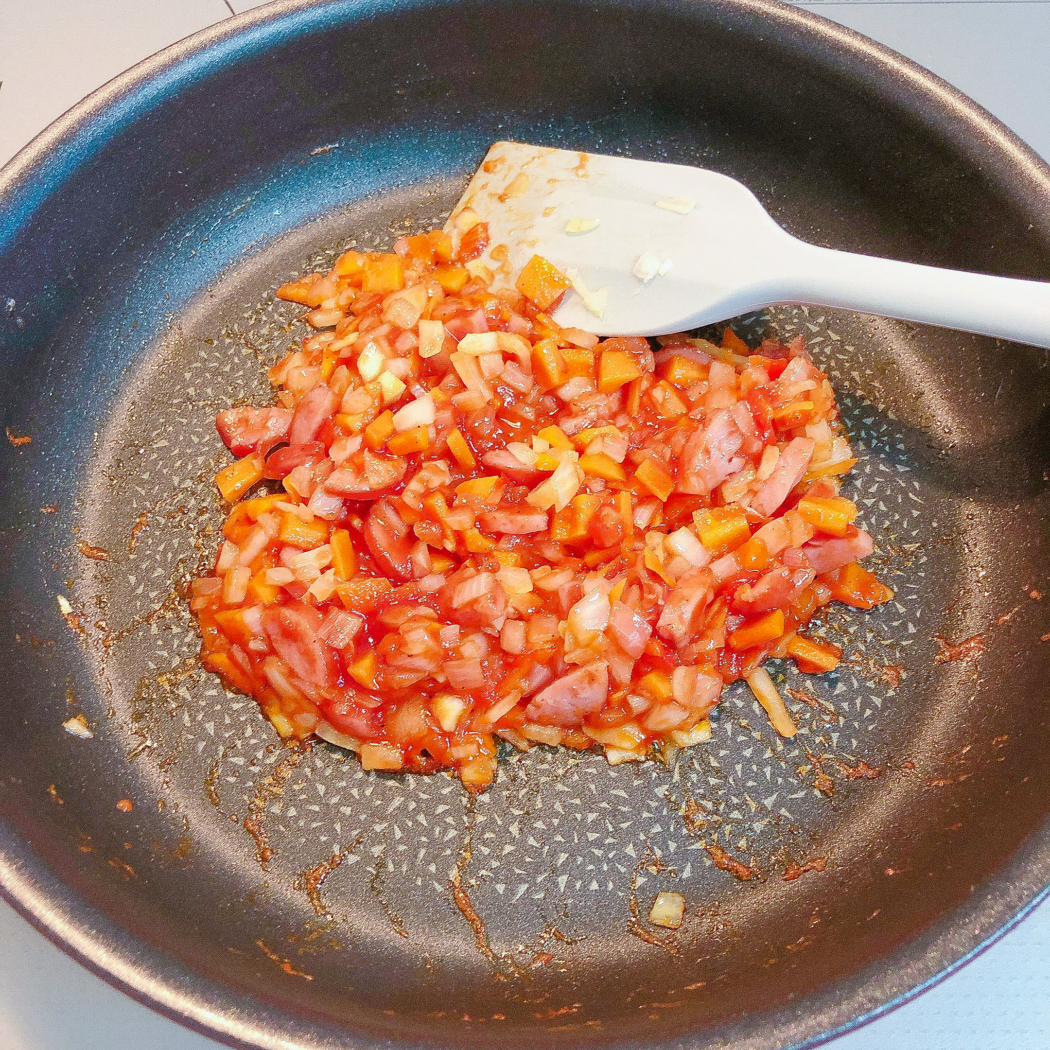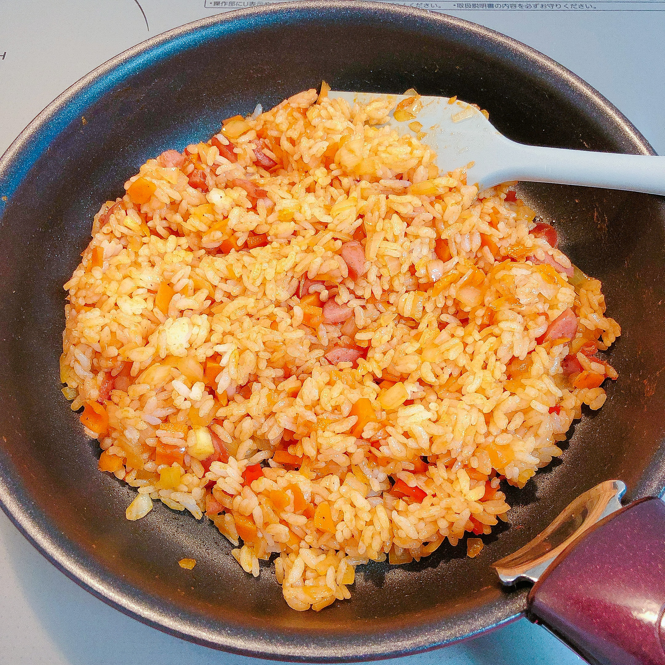 ③ご飯を入れて混ぜ合わせながら炒め、塩コショウで味を整えたらケチャップライスの完成です ◡̈♫