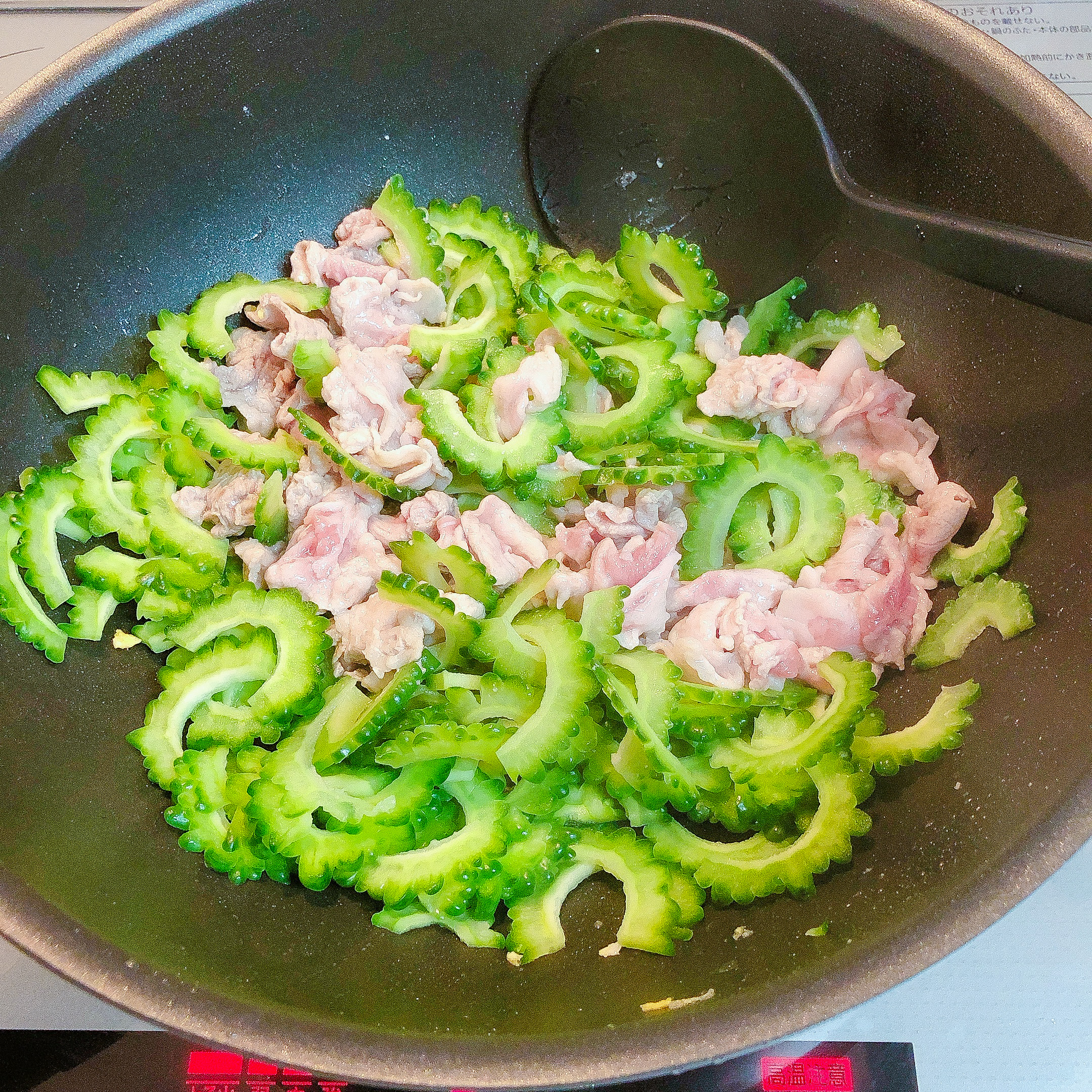 ③同じフライパンにごま油を敷き、胡椒と片栗粉を薄くまぶした豚肉を焼く。肉の色が変わったら、①のゴーヤをすすぎ水を切って投入し、炒める。