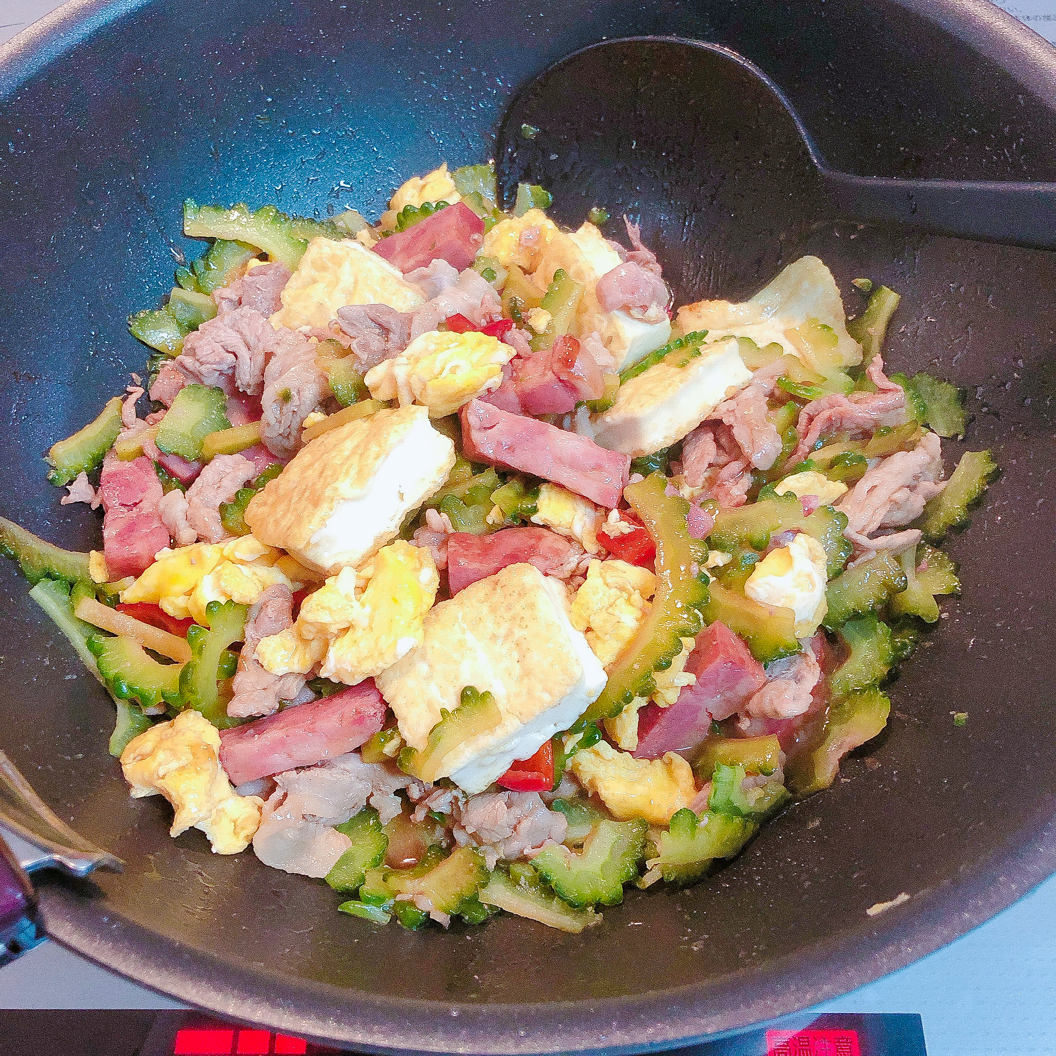 ④ゴーヤがしんなりしてきたら、〖調味料〗を加えて炒め、取り出しておいた炒り卵と豆腐を戻し全体を混ぜ合わせ炒める。