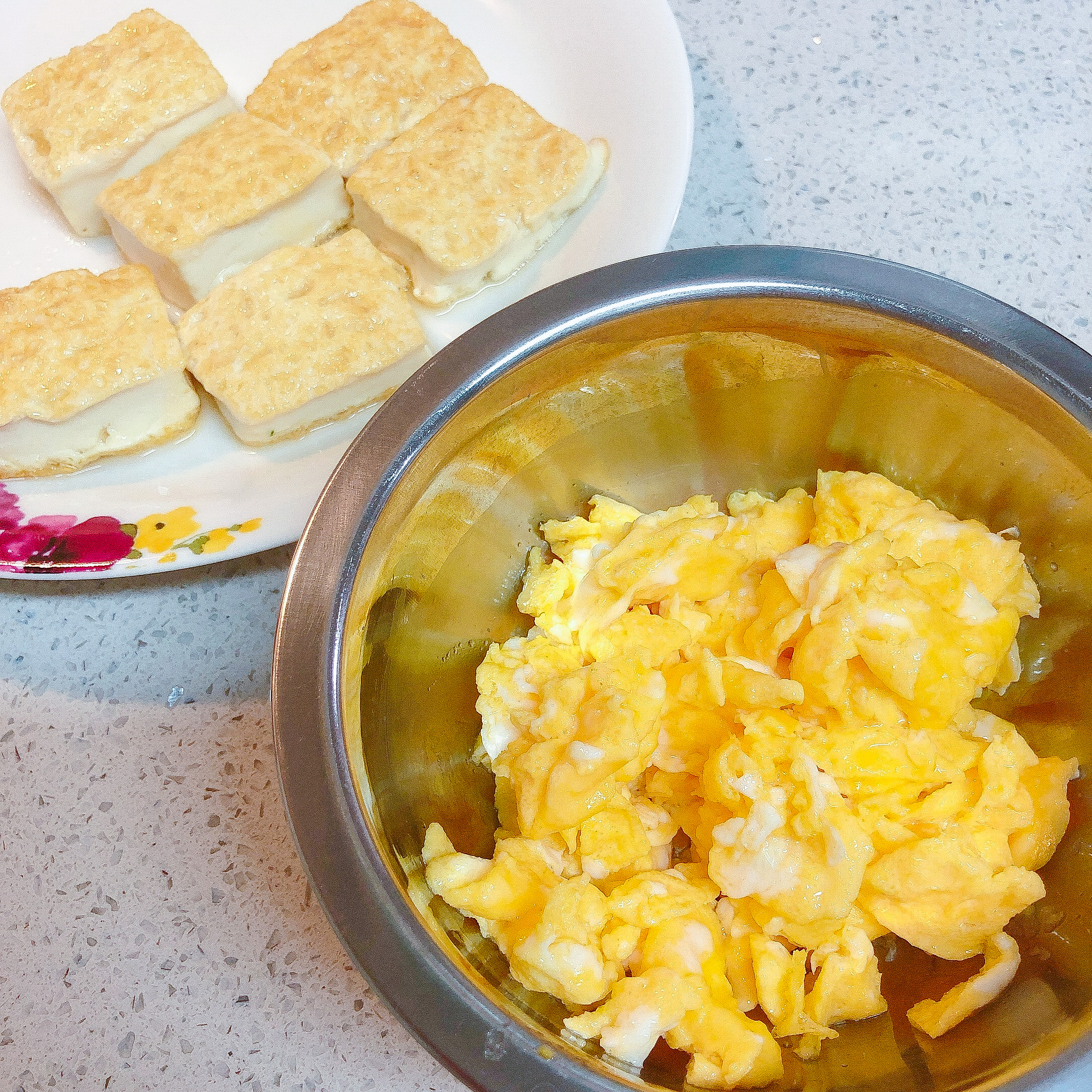 ②フライパンに油を敷き、豆腐を両面焼く。一旦取り出し、次は溶き卵を入れて 炒り卵を作り、取り出す。