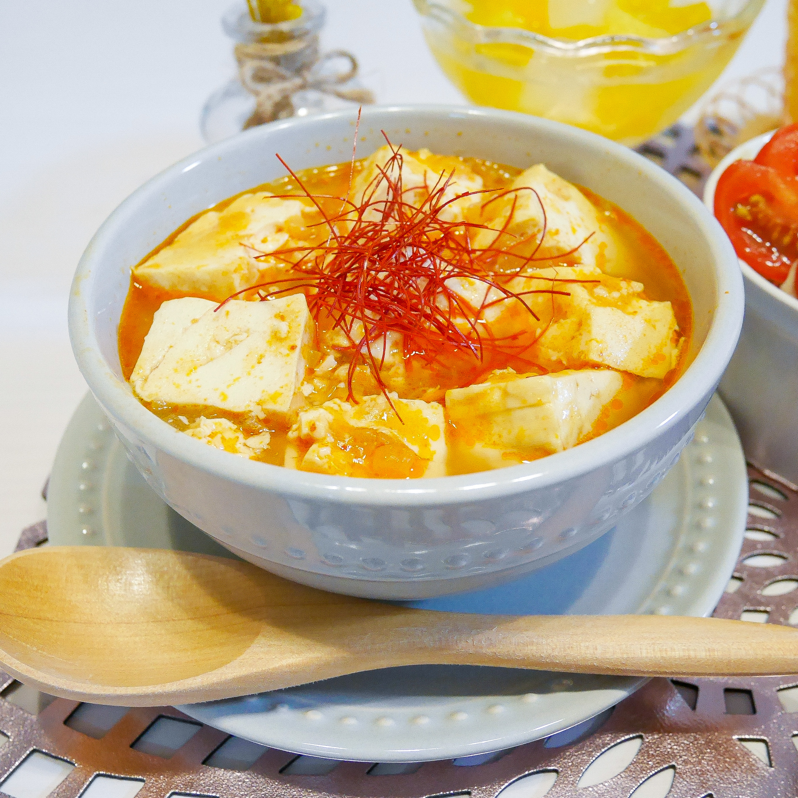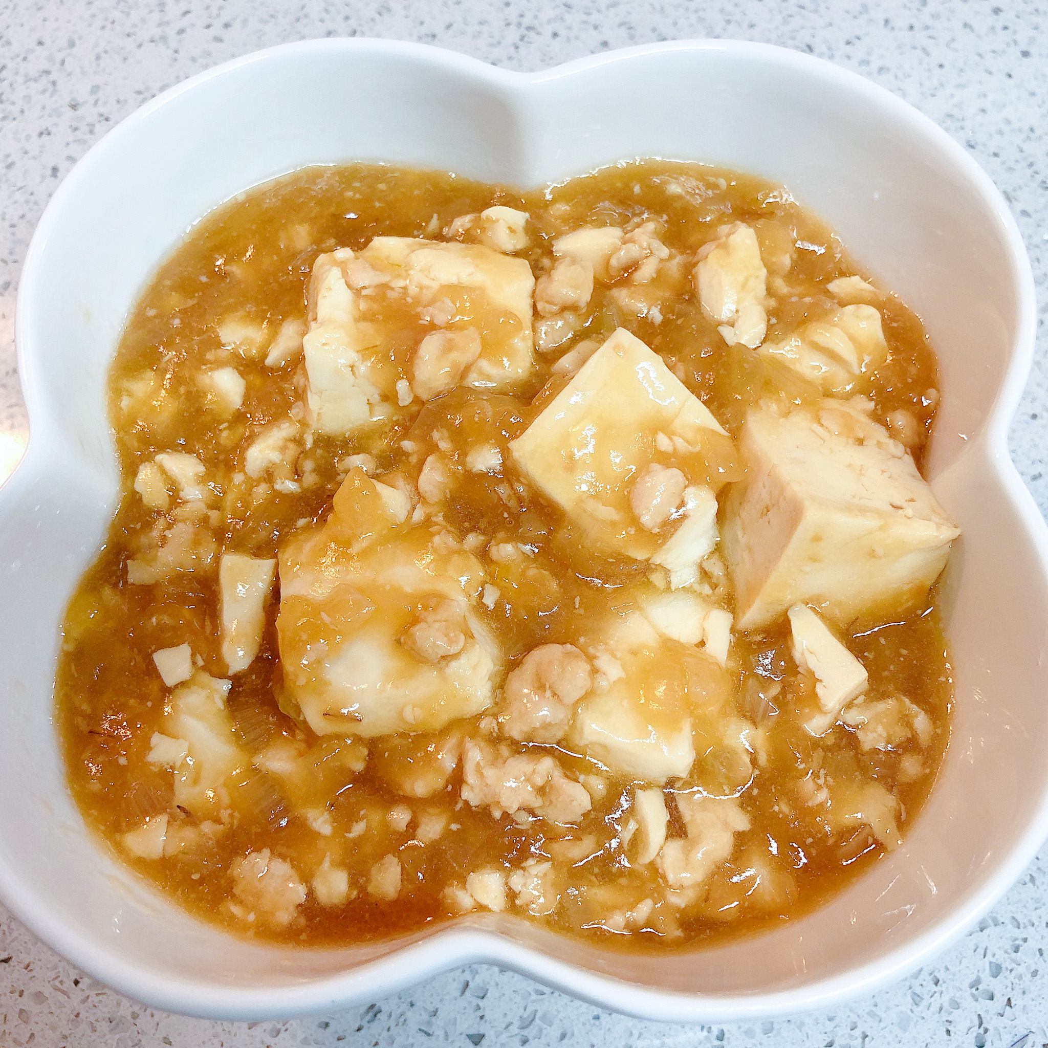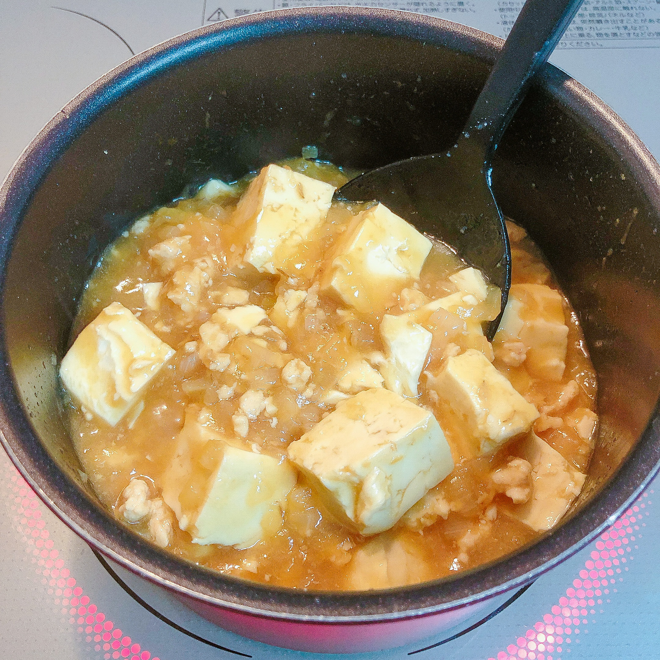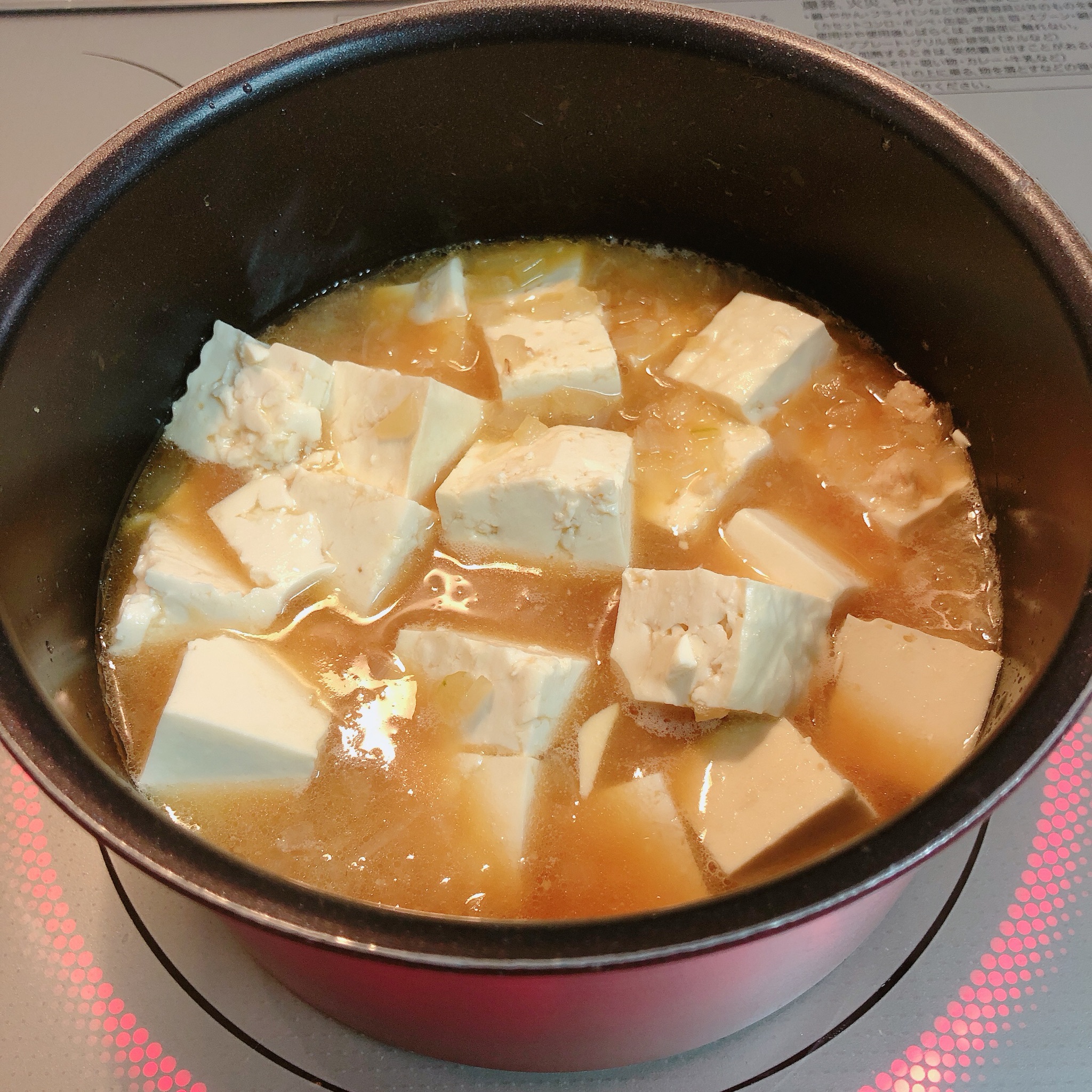 ①豆腐は大きめの角切りに、玉ねぎはみじん切りにする。