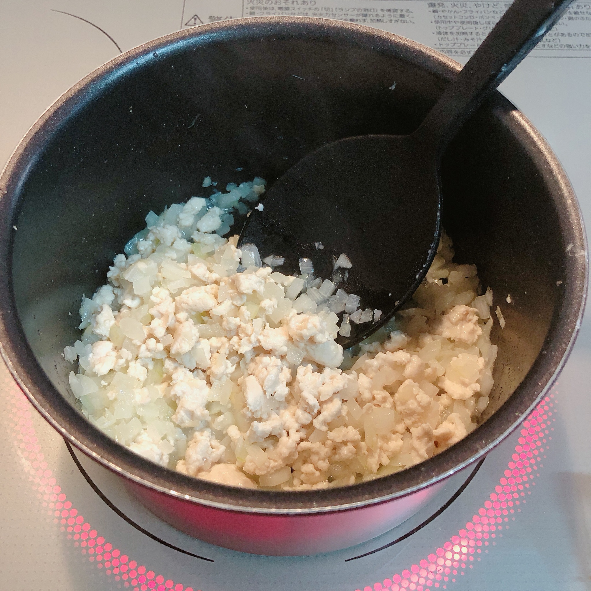 ②油を敷いたフライパンに 生姜チューブとにんにくチューブを入れて熱し、香りがたってきたら 豚挽肉と玉ねぎを入れて炒める。