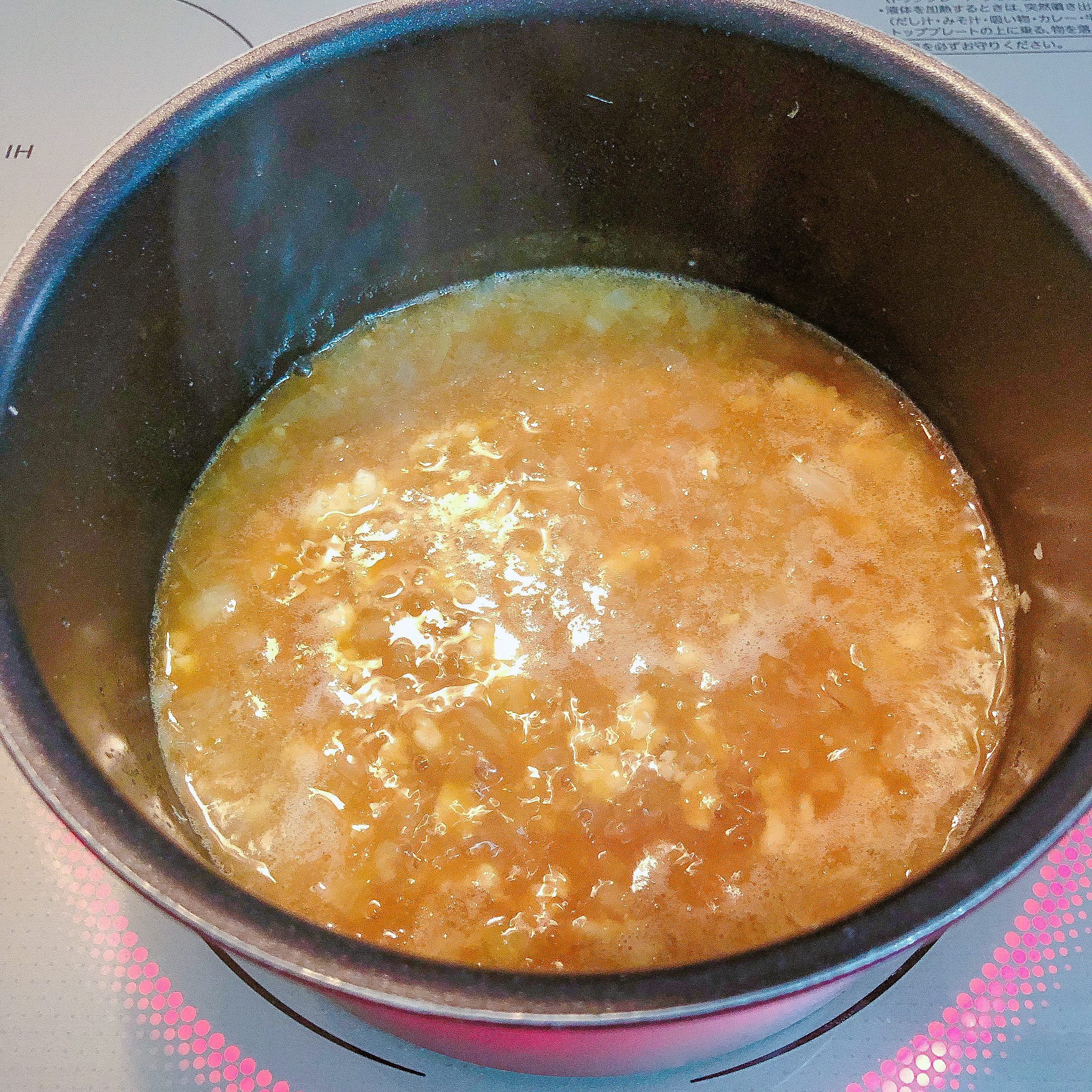 ③肉の色が変わったら、合わせておいた〖 調味料 〗を投入し、ひと煮立ちさせる。