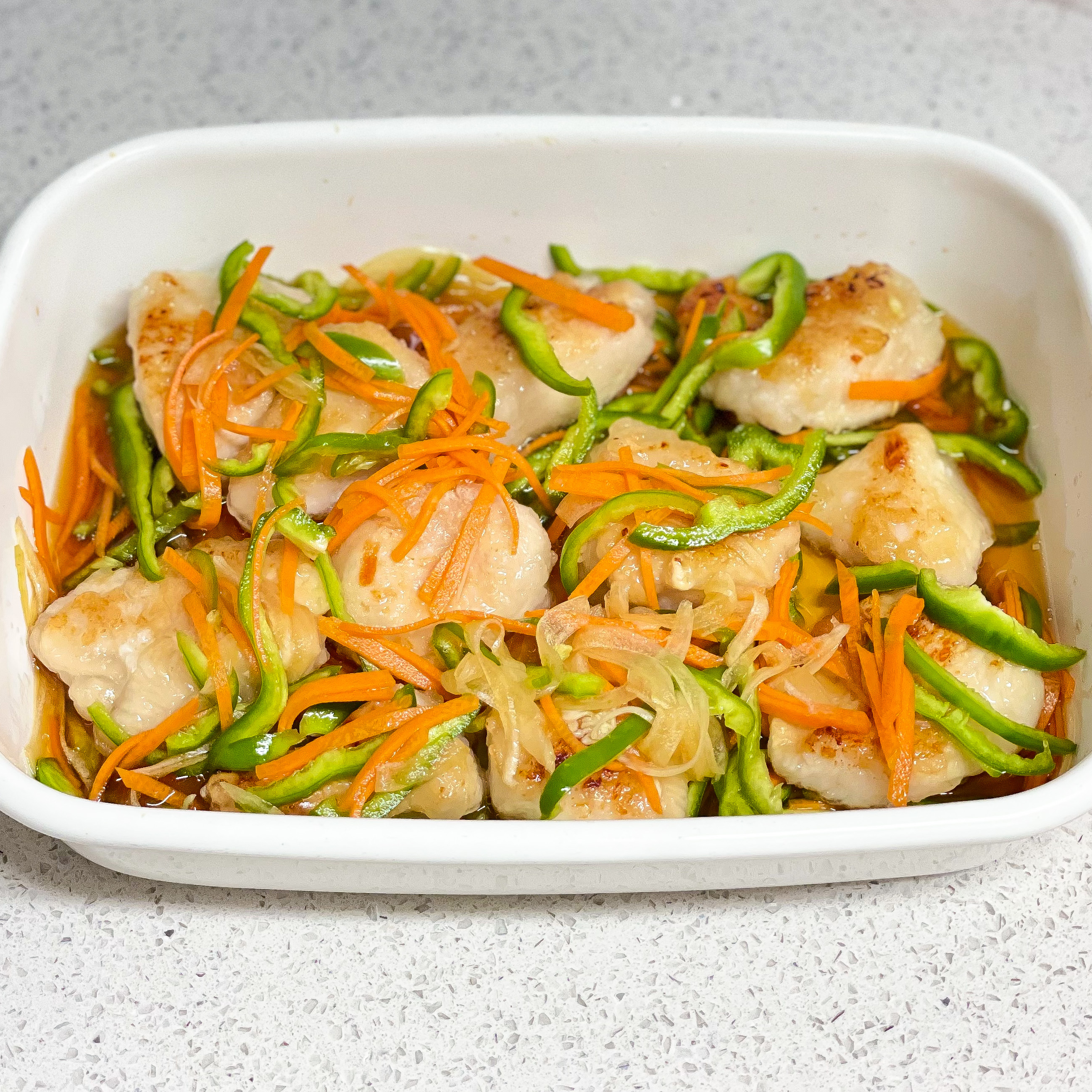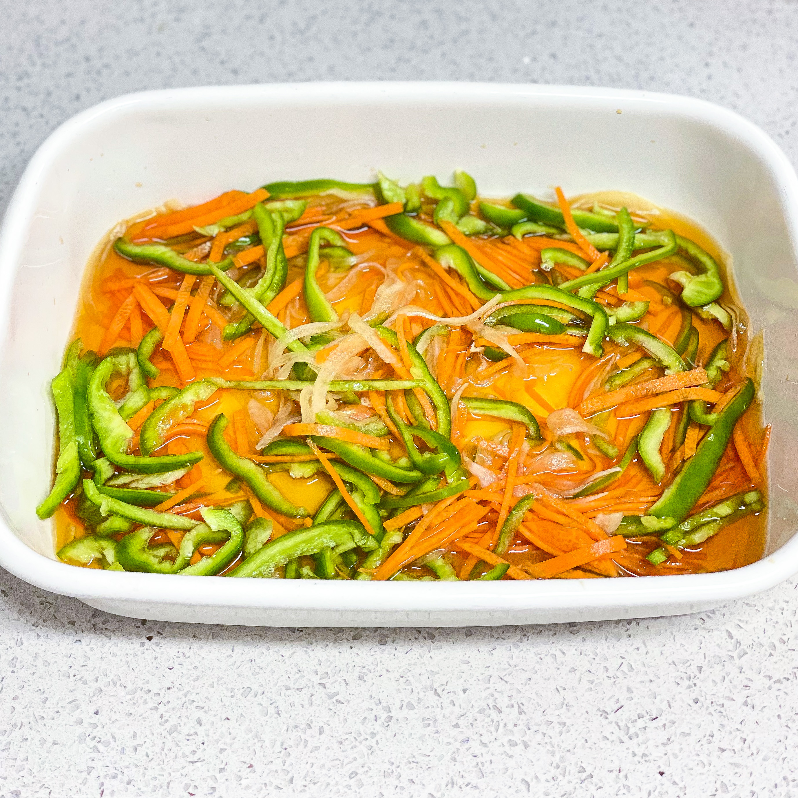 ③玉葱・人参・ピーマンは千切りにする。〖南蛮酢〗の材料をバットに入れてよく混ぜ合わせ、そこに浸しておく。