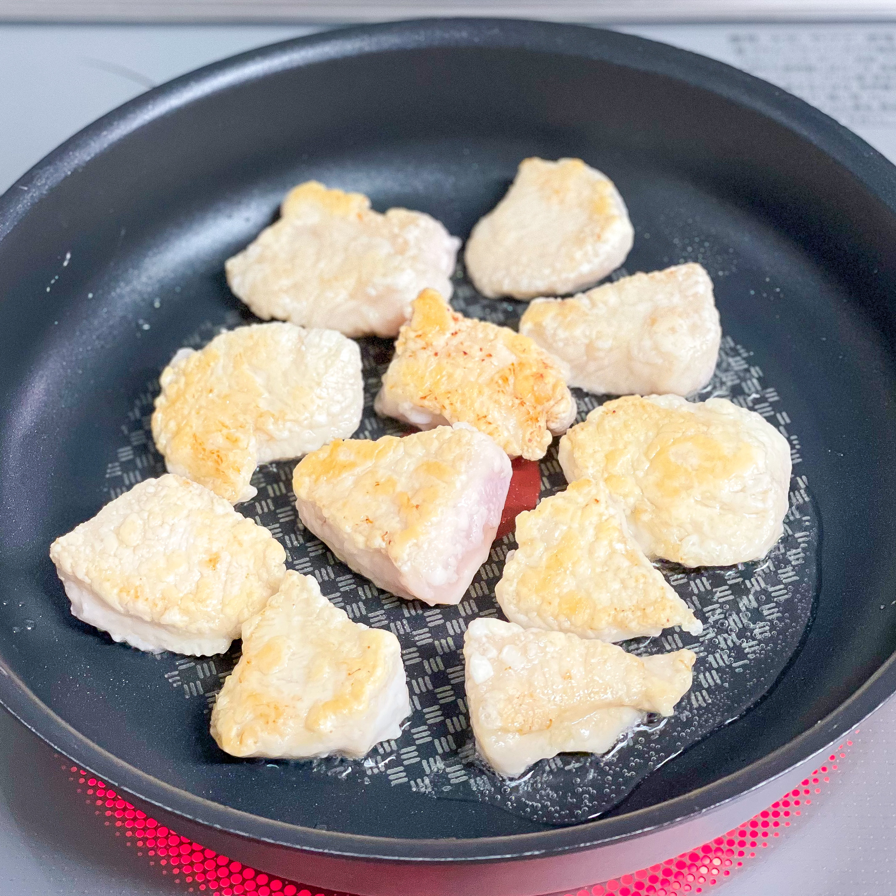 ② ①に片栗粉をまぶし、油を多めに敷いたフライパンでこんがり焼き色がつき火が通るまで焼く。