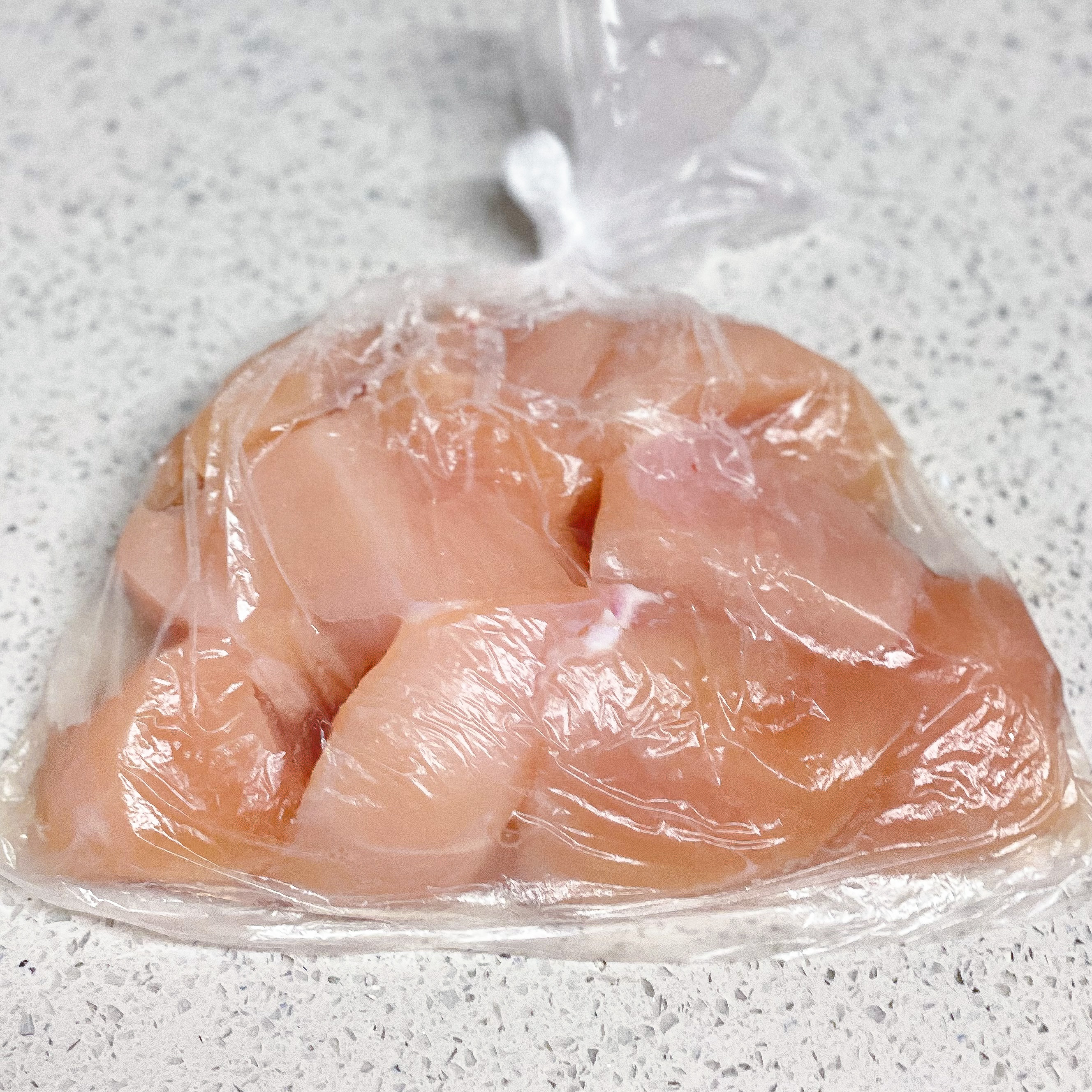 ①鶏胸肉は皮を取って一口大に切り、フォークでまんべんなく刺す。キッチン袋に〖ブライン液〗の材料を入れてもみ込み、しばらく置く。(30分〜)