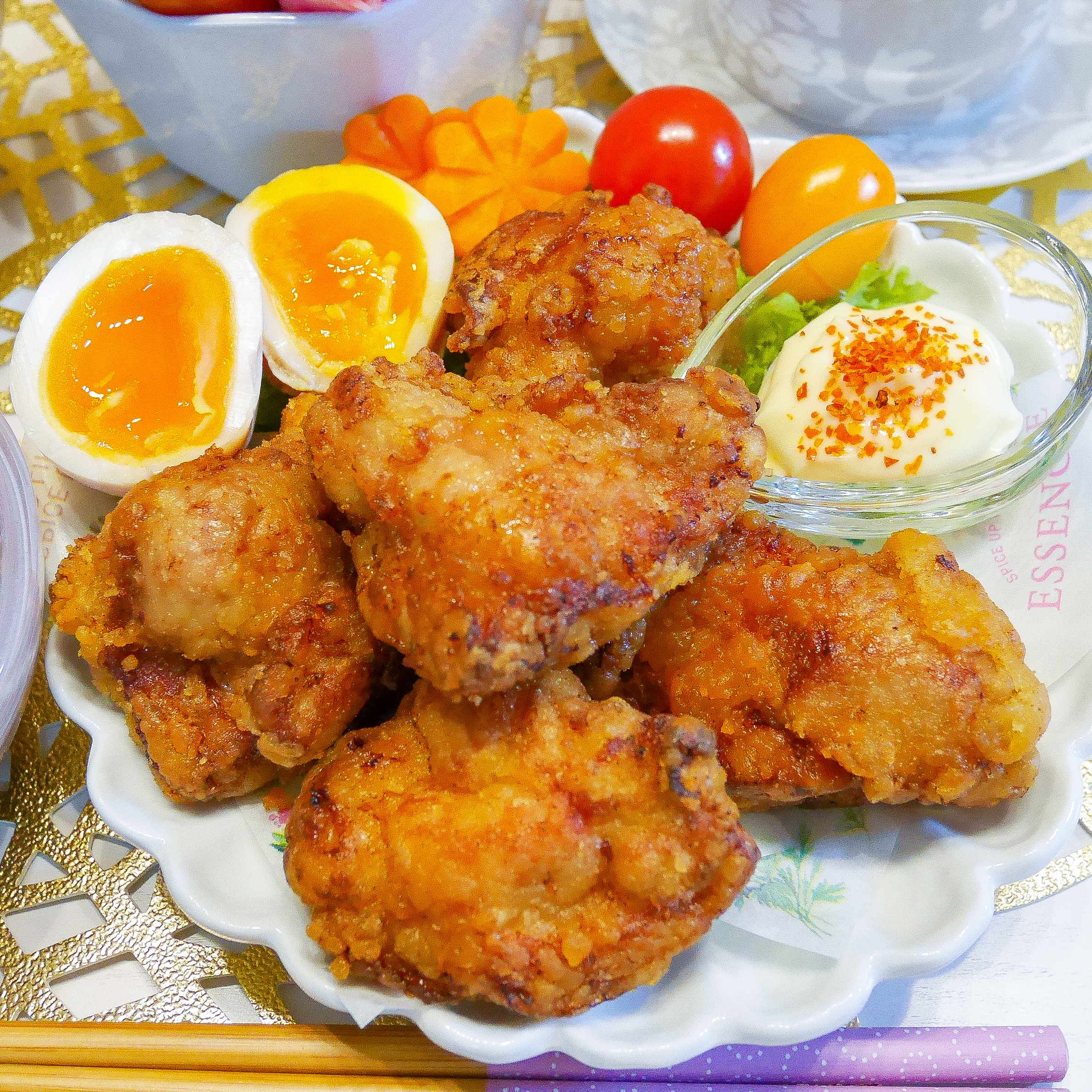 ④170℃に熱した油で、③を薄めのきつね色になるまで揚げ、取り出す。200℃に温度を上げ、お肉を戻し何度か返しながら、濃いめのきつね色に揚がったら、完成です ❤︎