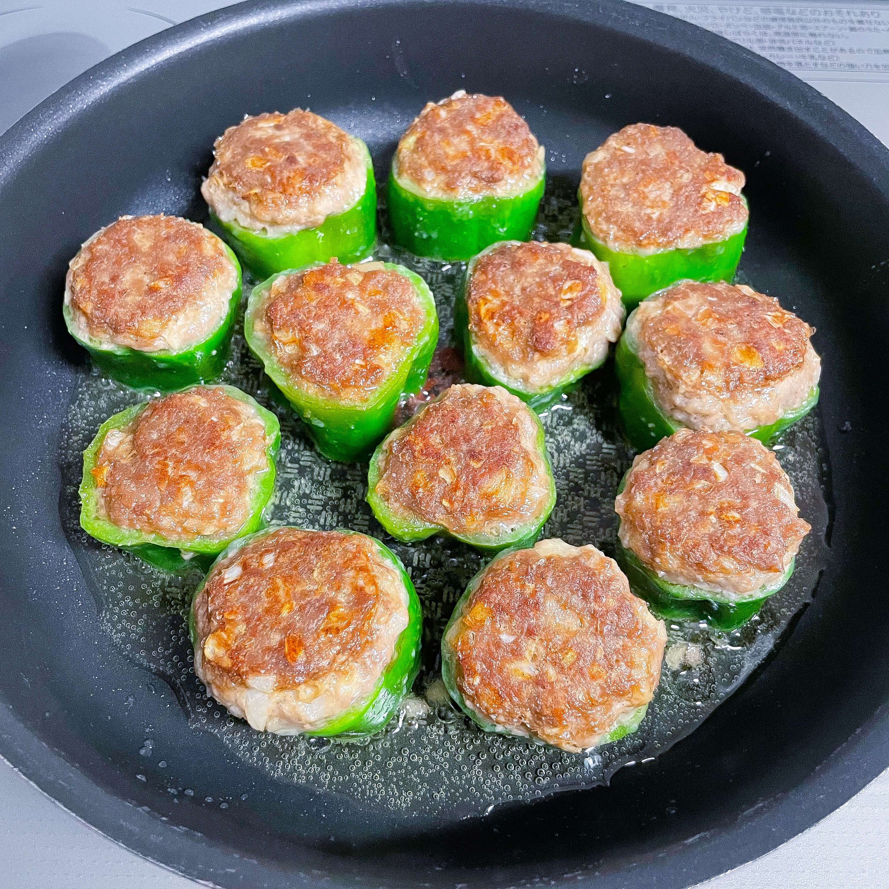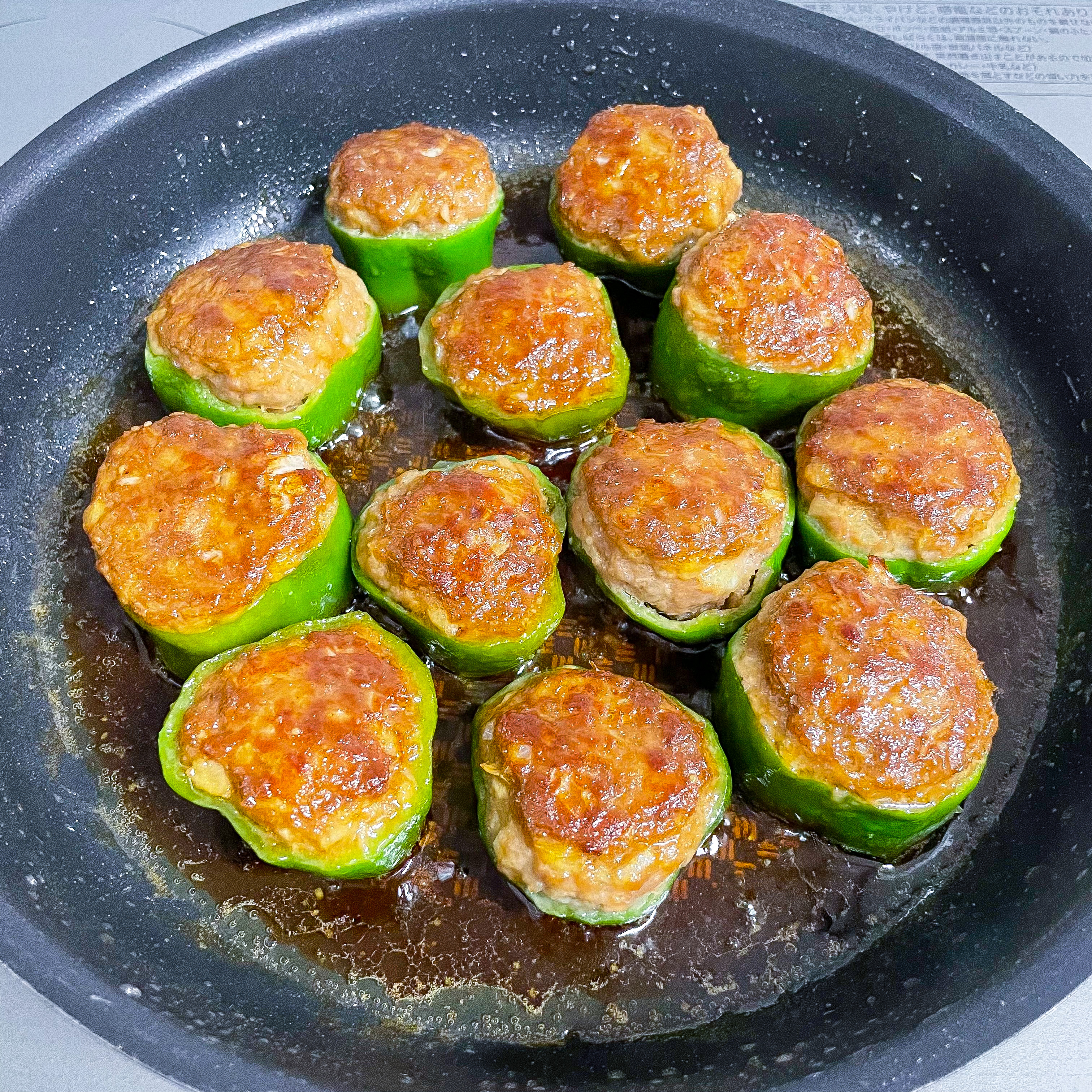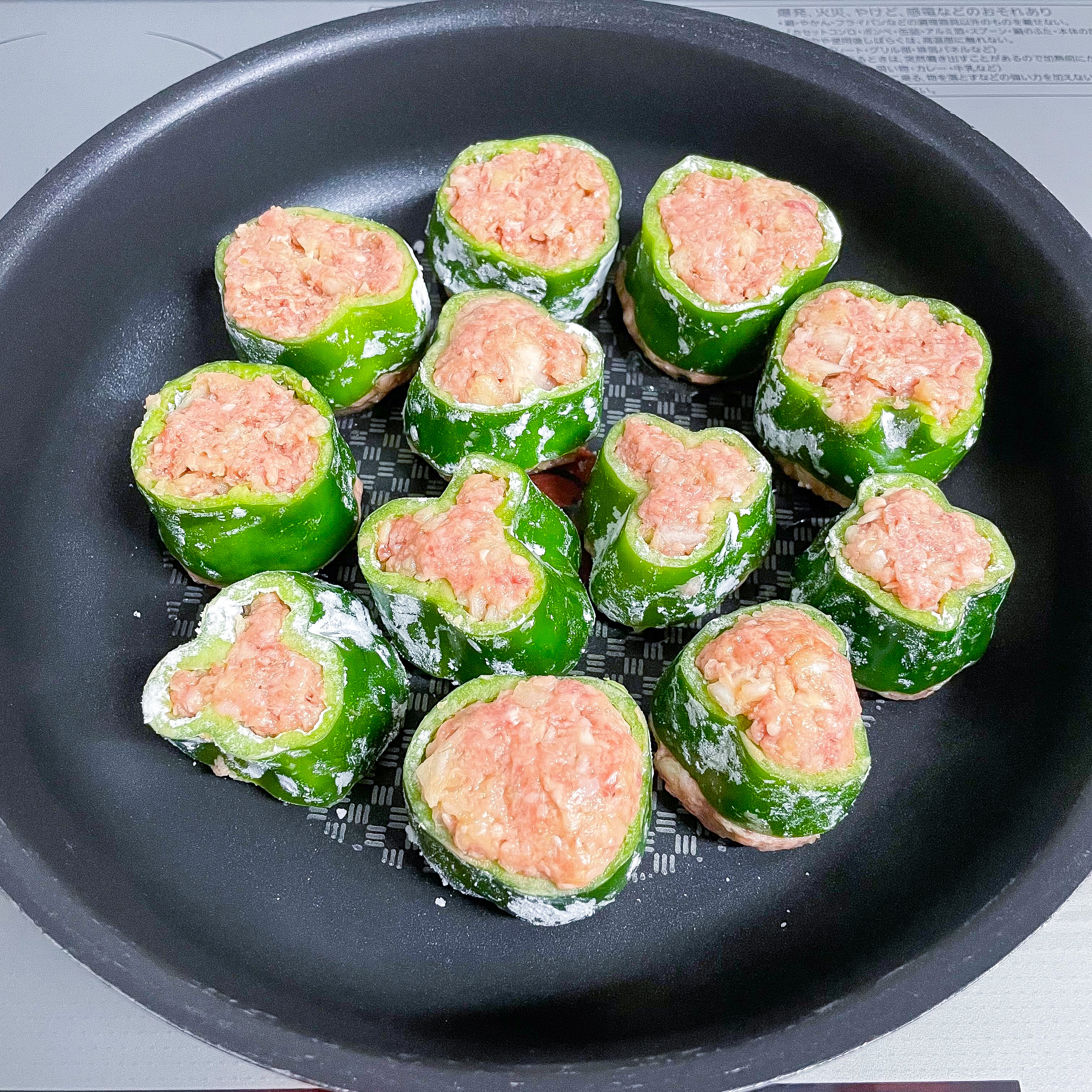 ⑤ ③のタネを12等分して丸め、④のピーマンに詰める。油を引いたフライパンに並べていく。