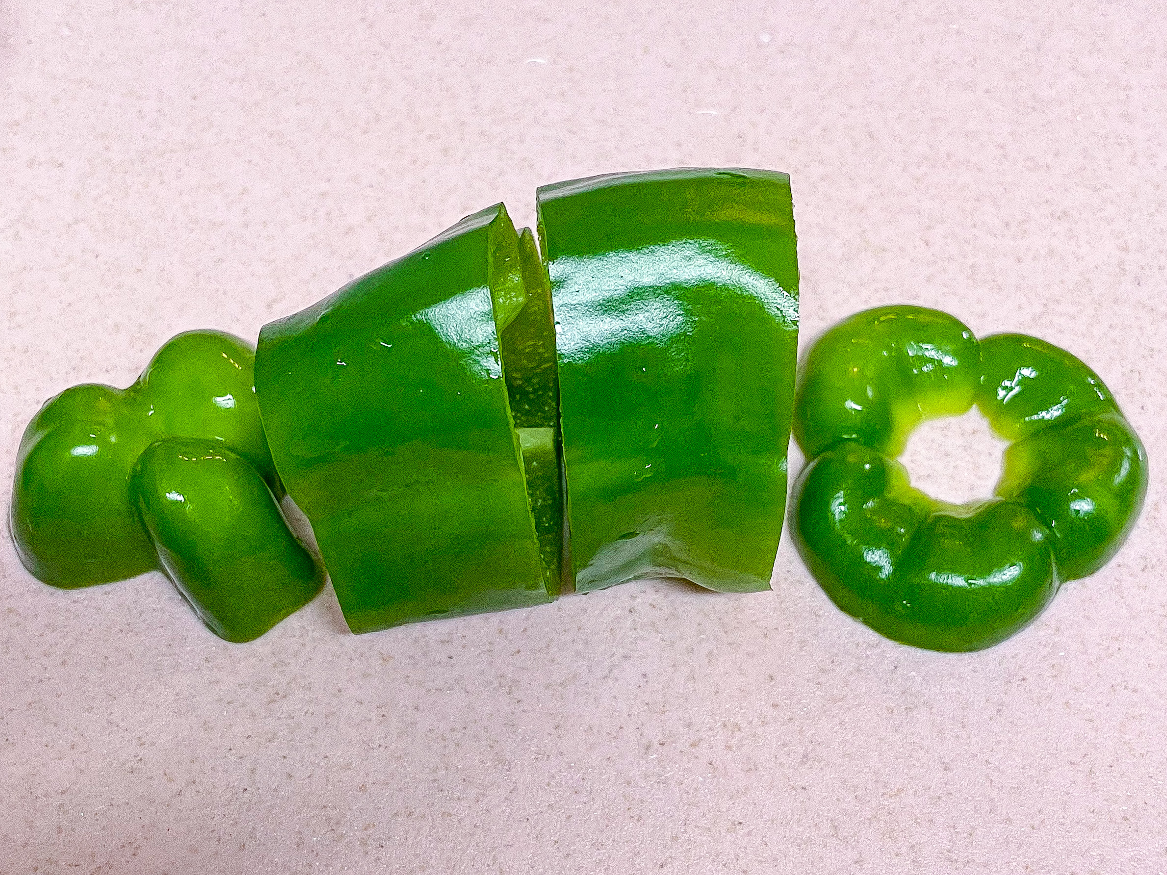 ①ピーマンを洗って、頭(ヘタ)とおしり( ? )を切り落とし、種を取る。二等分に、輪切りにしてキッチンペーパーで水分を取っておく。